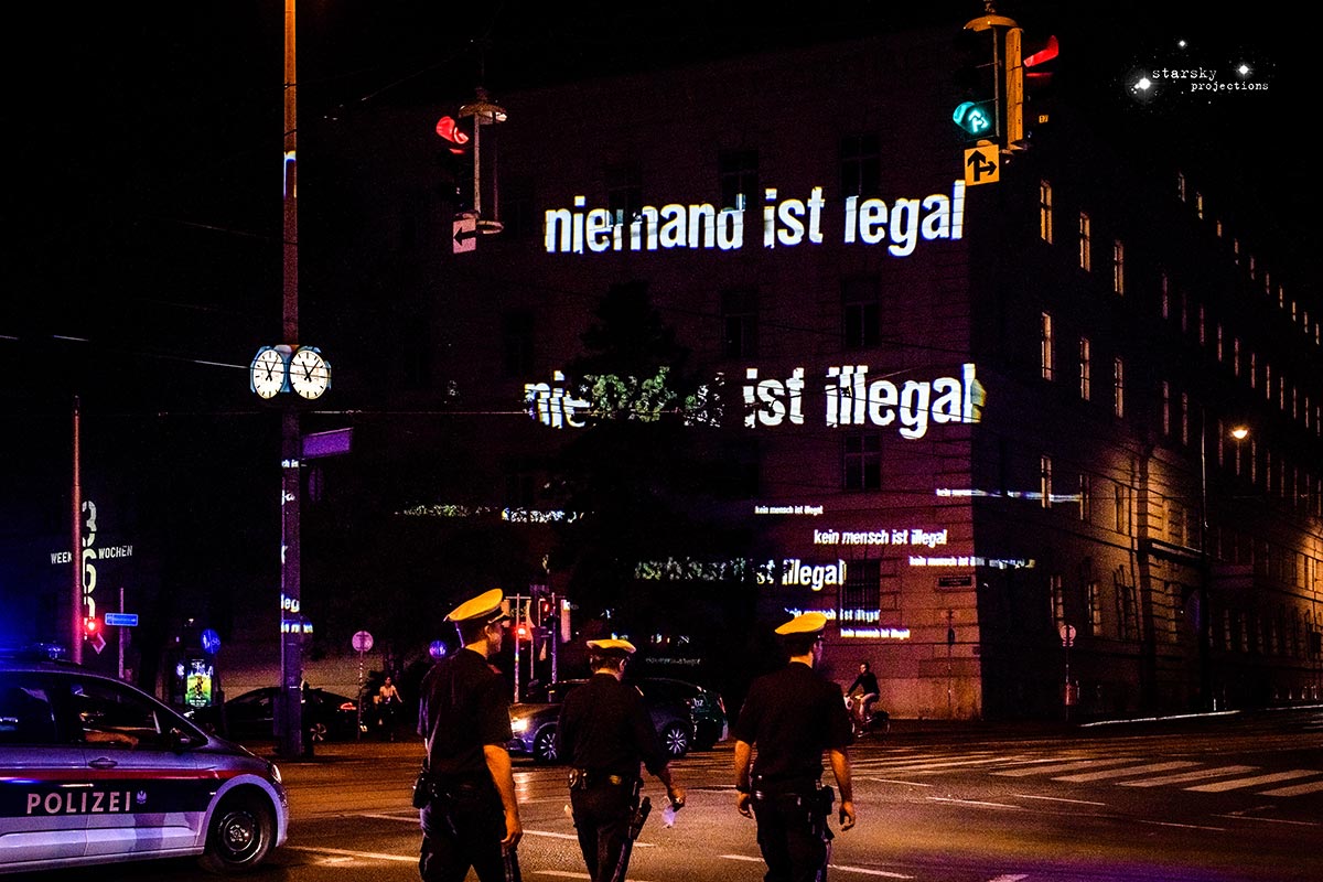 zu den waffeln ! wir worten zurück !! projektions guerilla tour wien 2018 projektion : starsky foto : osaka